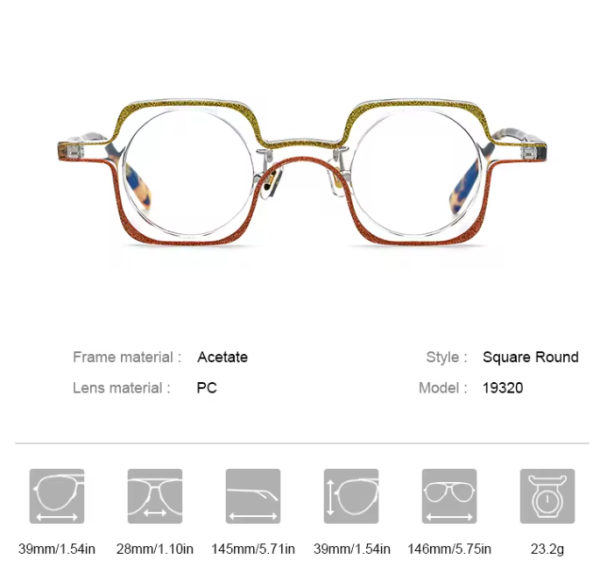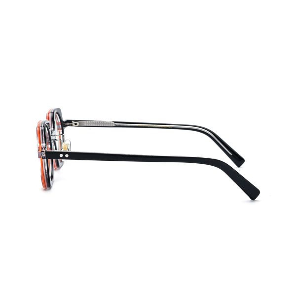 This acetate glasses frame in orange-black and gold-brown features a square frame design with circular lenses, unique and stylish. Suitable for both men and women, it customizes myopia glasses with optical prescription technology to meet personalized vision needs. Crafted with exquisite workmanship and high-quality materials, it ensures comfort and durability. Whether for everyday wear or fashion statement, it exudes elegance and style.