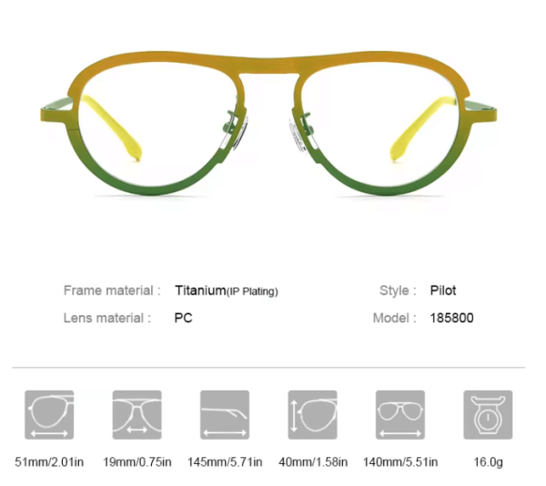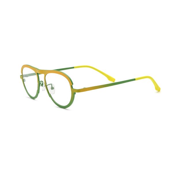 This aviator-style pure titanium glasses frame offers a wide range of options for both men and women. Each frame features two-color combinations such as yellow-green, pink-green, blue-green, and blue-red. Crafted from high-quality pure titanium, these frames are lightweight, durable, and exceptionally comfortable. Their classic aviator design is both fashionable and practical, suitable for various occasions. Whether you need prescription eyewear for everyday use or simply want a stylish accessory, these frames have you covered.