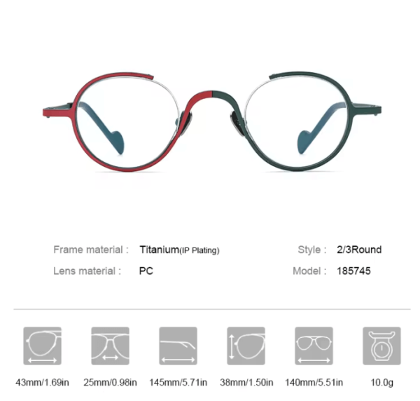 This matte pure titanium glasses frame combines a unisex design with a unique round shape, making it an ideal choice for individuals with myopia. Crafted from lightweight titanium, it offers a comfortable wearing experience while exuding a fashionable style. The 2/3 round design is both elegant and distinctive, suitable for various face shapes. Transparent lenses can be customized according to personal prescriptions, ensuring clear vision. each frame comes in a unique color, offering a personalized selection.Practical yet stylish, this eyeglass frame showcases unique personality charm for both men and women.