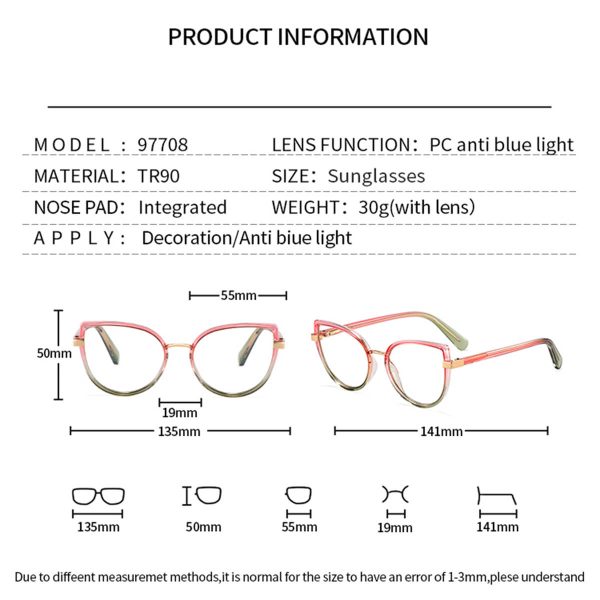 | Color | Blue pink, Gloss black clear, Gloss black, Grey champagne, Khaki brown, Leopard clear, Pink green, Purple pink |