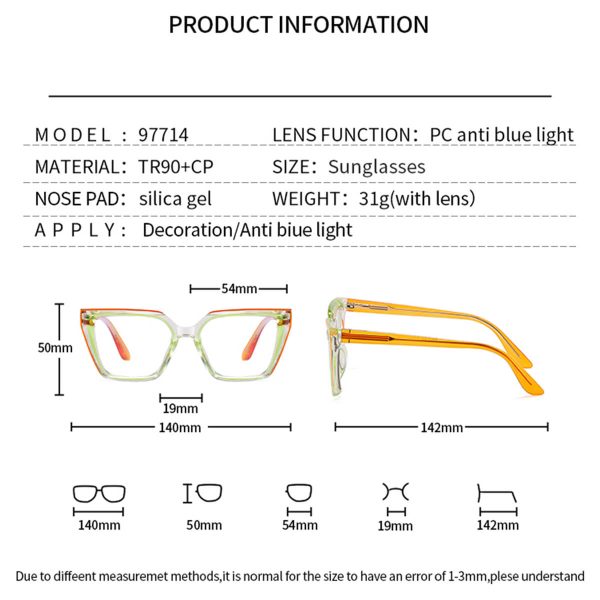 | Color | Blue purple pink C3, Gloss black clear C1, Green grass bright yellow C7, Light orange coffee C5, Orange pink mint green C6, Sky blue foggy purple C8, Transparent leopard C2, Transparent pink cameo brown C4 |