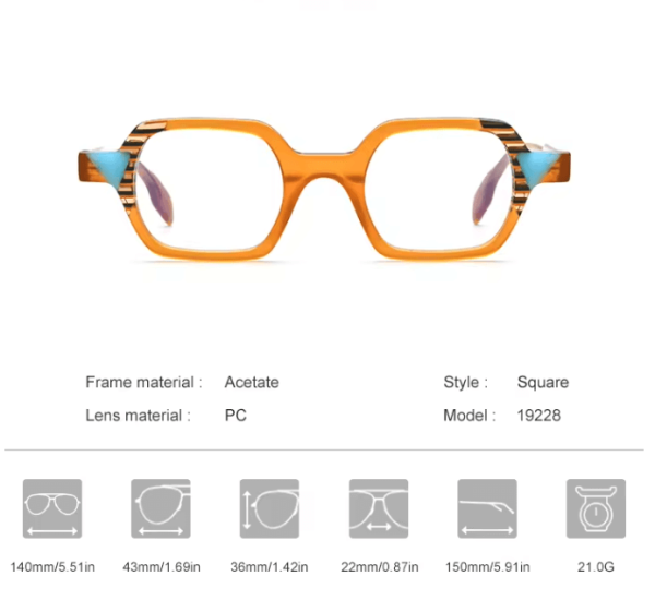 This square acetate glasses frame for men and women comes in five colors: transparent red, orange, yellow green, transparent green, and black. Crafted from high-quality acetate material, these optical prescription spectacles frames are both fashionable and functional. Whether you’re at the office or enjoying leisure time, you can find a color that suits your style. Additionally, these glasses can be customized with prescription lenses to provide you with a comfortable visual experience.