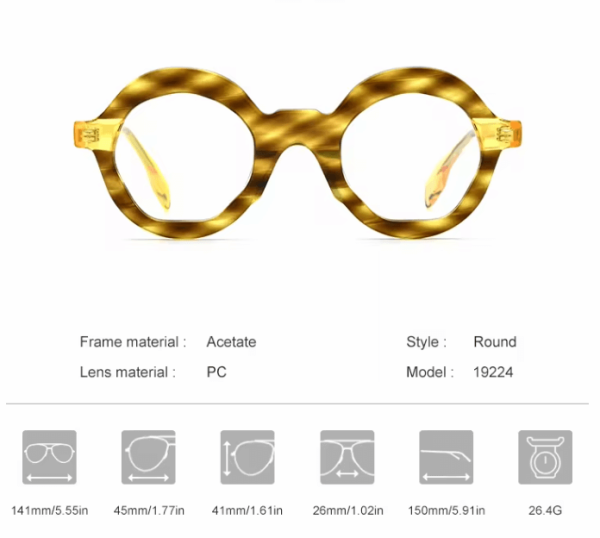 This acetate glasses frame for men and women in 2022 features a retro round design, crafted from high-quality acetate material. It showcases a classic style that blends fashion with personality, suitable for everyday wear and various occasions. The glasses offer comfort and durability, accommodating different prescription strengths to meet varying visual needs. Whether for office work, leisure time, or social gatherings, they exude a unique taste and style. With a focus on quality and confidence, these glasses will undoubtedly become an indispensable part of your fashionable accessories.